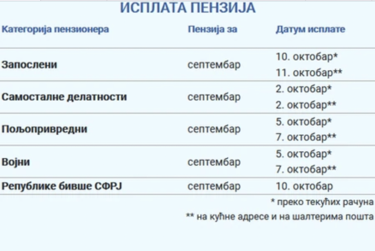 Penzioneri iz kategorije zaposlenih svoje prinadležnosti će primiti 10. oktobra preko tekućih računa, a dan kasnije na kućne adrese i na šalterima isporučenih pošta.