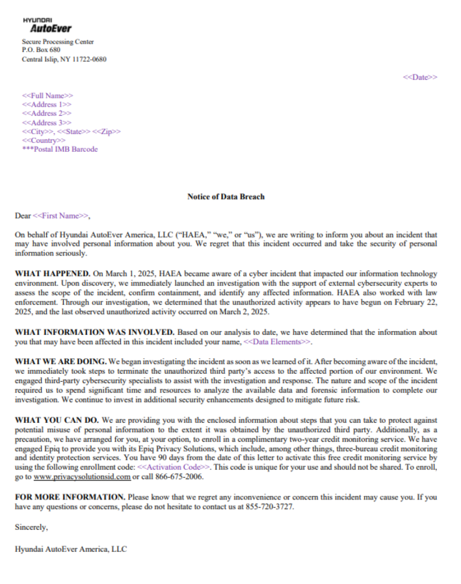 Kompanija, koja je u vlasništvu Hyundai Motor Group i sedištem u Kaliforniji, otkrila je da je 1. marta 2025. godine primetila sajber incident koji je uticao na njeno IT okruženje. Istragom je utvrđeno da su napadači stekli neovlašćeni pristup 22. februara i da su ostali u sistemu do 2. marta.