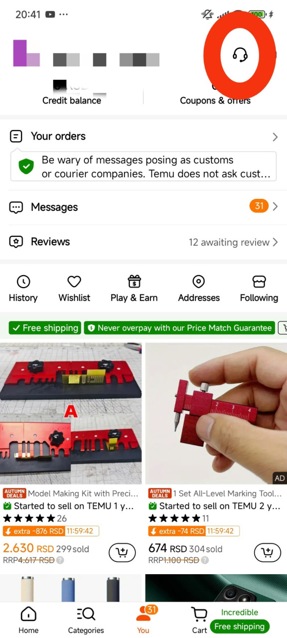 - To je njihova korisnička podrška, pa sam u odeljku "Imate li pitanja?" napisao da sam slučajno pritisnuo dugme za plaćanje. Iste sekunde (odgovor je automatizovan), dobio sam poruku da će mi novac biti vraćen u vidu Temu kredita i da je porudžbina otkazana - govori Dragan.