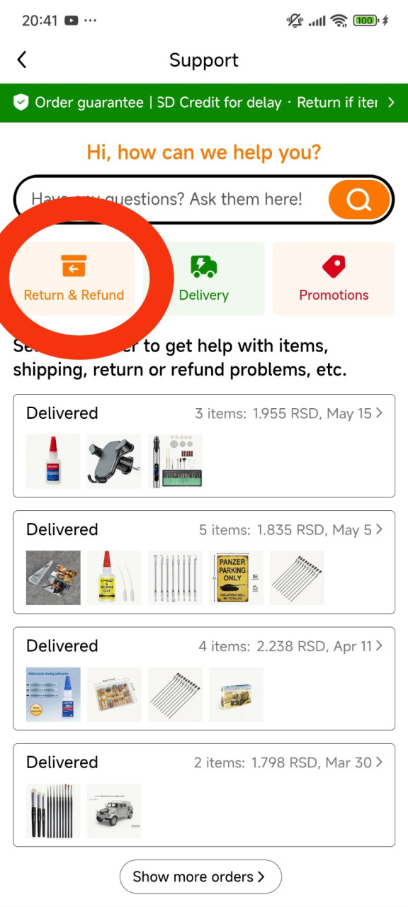 Treći korak - postaviti pitanje ili odabrati opciju "povrat i refundiranje" (Return & Refund)