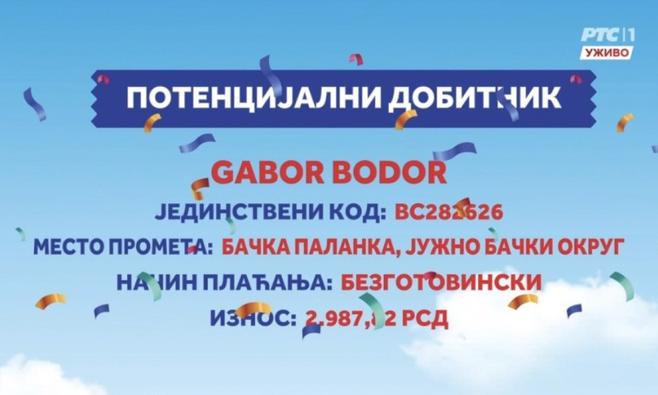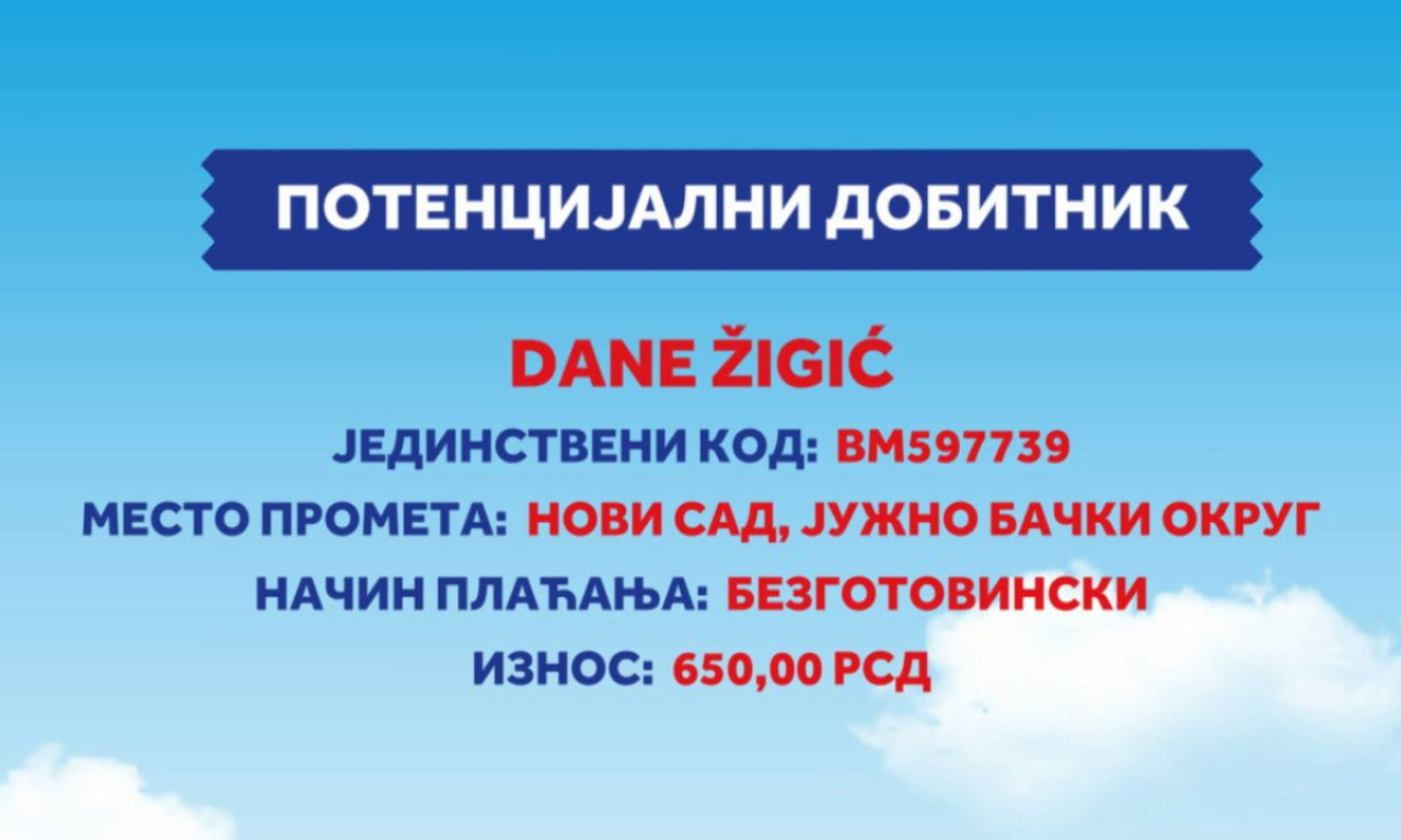Srećni dobitnik stana u naselju Zemunske kapije je svoj račun platio u Novom Sadu, u Južnobačkom okrugu. Vrednost računa iznosila je 650 dinara, a jedinstveni kod koji mu je doneo nagradu glasio je BM597739.