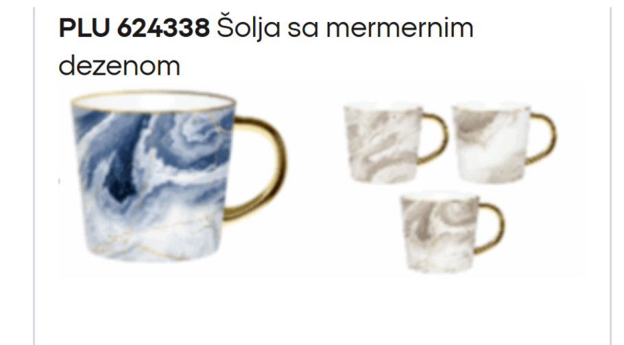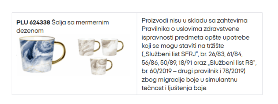 Diskontni lanac Pepco povukao je sa tržišta Srbije dve šolje sa mermernim dezenom, belu i plavu, jer ne ispunjavaju bezbednosne standarde.