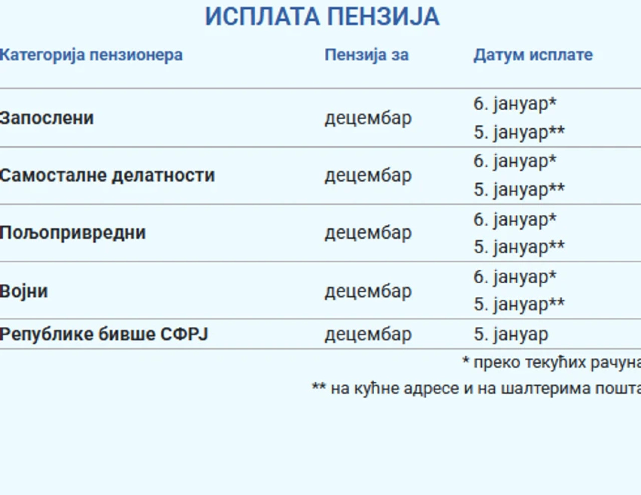 Penzioneri iz kategorije zaposlenih dobiće penzije tog dana na šalterima pošte, dok će isplata na tekuće račune biti 6. januara.
