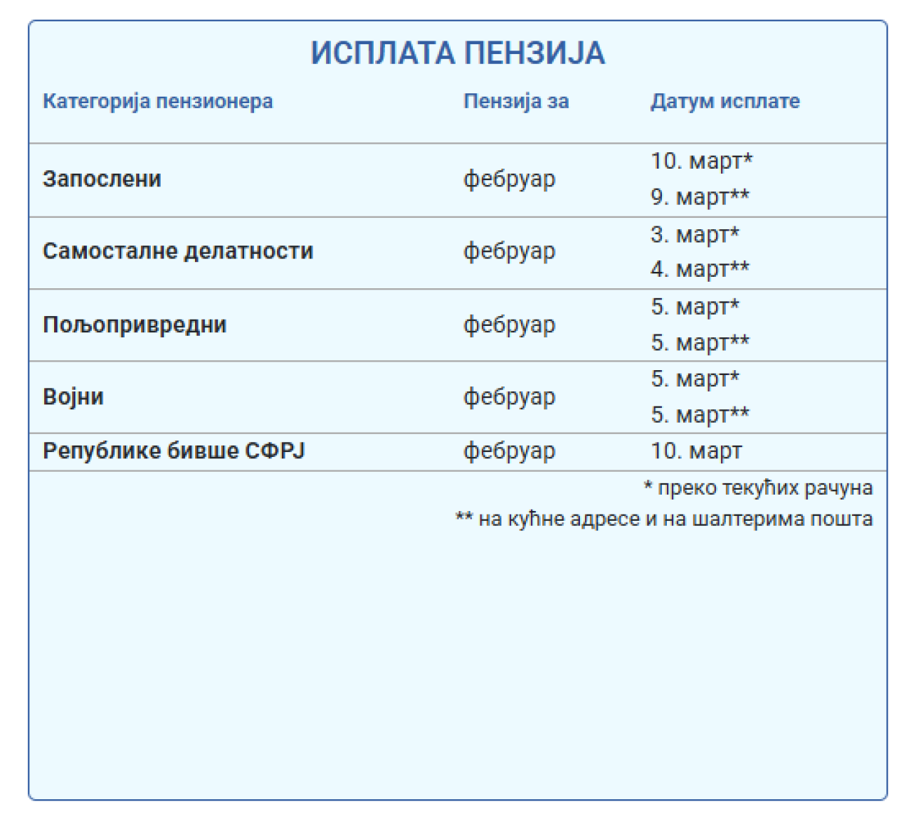 Penzioneri iz kategorije zaposleni svoj novac dobijaju 9. marta na kućne adrese i na šalterima pošta, dok će 10. marta biti isplata preko tekućih računa.