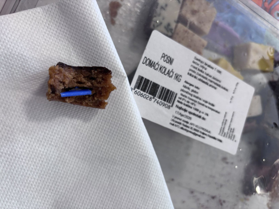 Kupovina u marketu Svetofor u Obrenovcu pretvorila se u neugodno iznenađenje kada je u pakovanju sitnih kolača, odnosno u samoj poslastici pronađen komad oštre plastike.