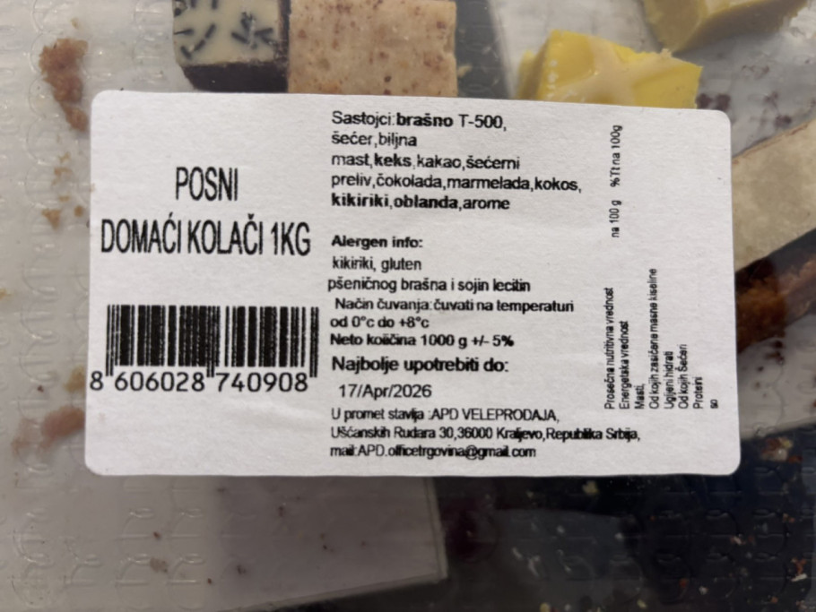 Kolači su na deklaraciji označeni kao "Posni domaći kolači 1KG".