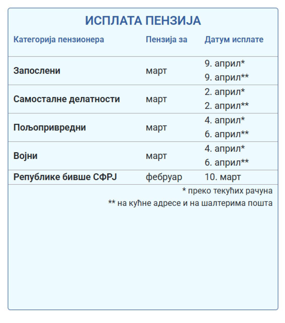 Poslednji na listi za isplatu penzija su penzioneri iz kategorije zaposleni, njima će penzije leći 9. aprila preko tekućih računa i na kućne adrese i na šalterima pošta.