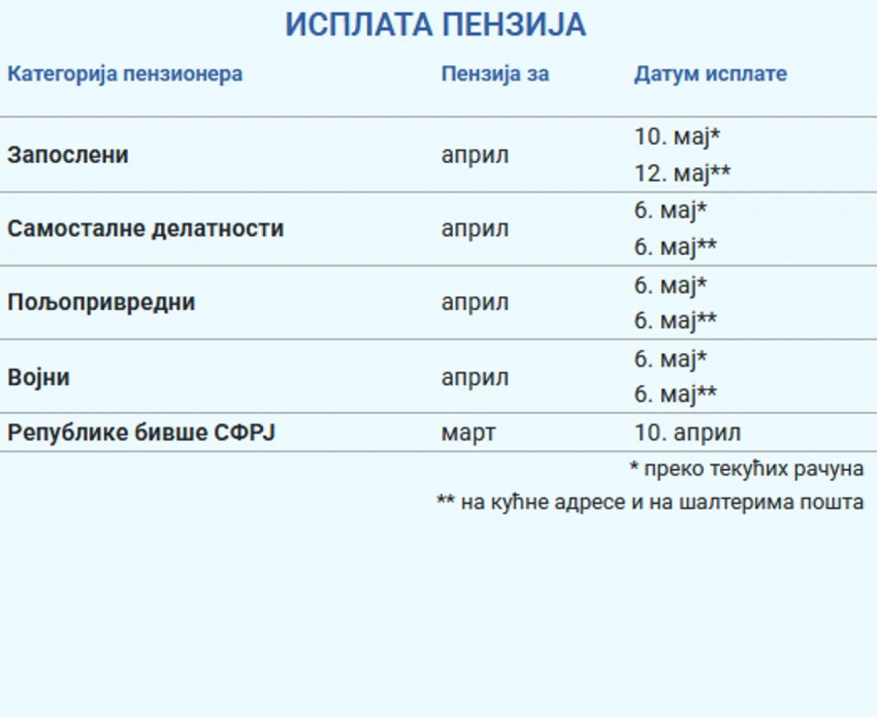 Republički fond za penzijsko i invalidsko osiguranje pbjavio je da će za penzionere iz kategorije zaposlenih isplata penzija za april biti 10. maja na tekuće račune, a od 12. maja na kućne adrese i u poštama.