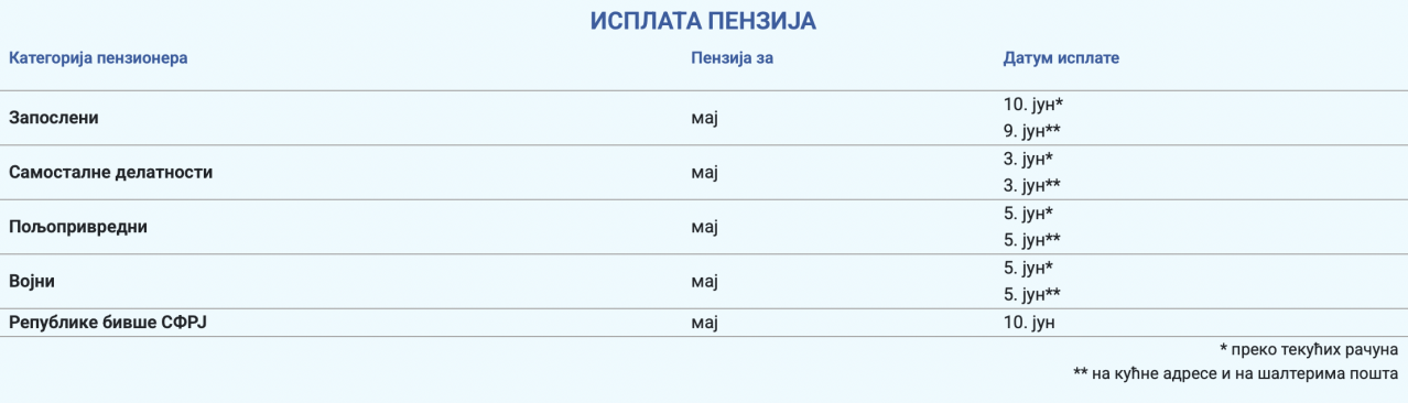 Dva dana kasnije, 5. juna počeće isplata za vojne i poljoprivredne penzionere i to kako one koji penzije primaju preko tekućih računa tako i one kojima penzije stižu na kućne adrese ili ih podižu na šalterima pošta.