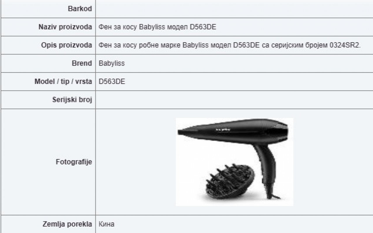Opis proizvoda: Fen za kosu robne marke Babyliss model D563DE sa serijskim brojem 0324SR2.