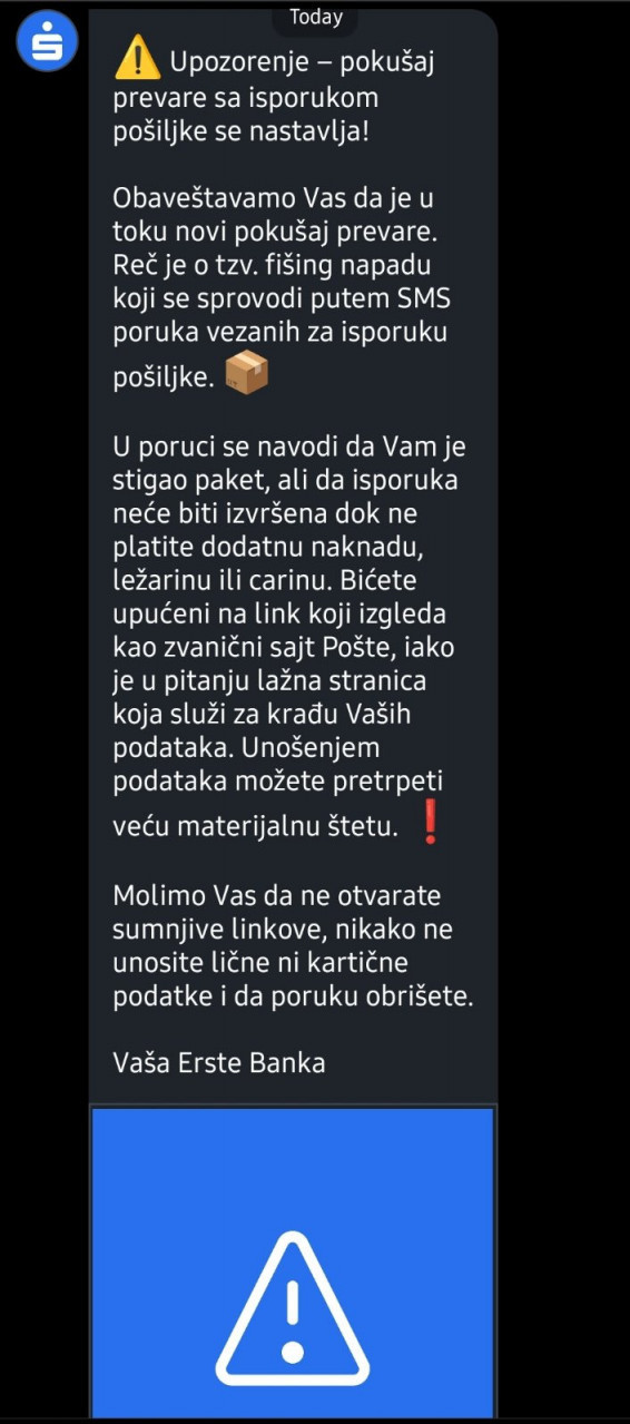 - U poruci se navodi da Vam je stigao paket, ali da isporuka neće biti izvršena dok ne platite dodatnu naknadu, ležarinu ili carinu. Bićete upućeni na link koji izgleda kao zvanični sajt Pošte, iako je u pitanju lažna stranica koja služi za krađu Vaših podataka. Unošenjem podataka možete pretrpeti veću materijalnu štetu - navode iz Erste Banke.