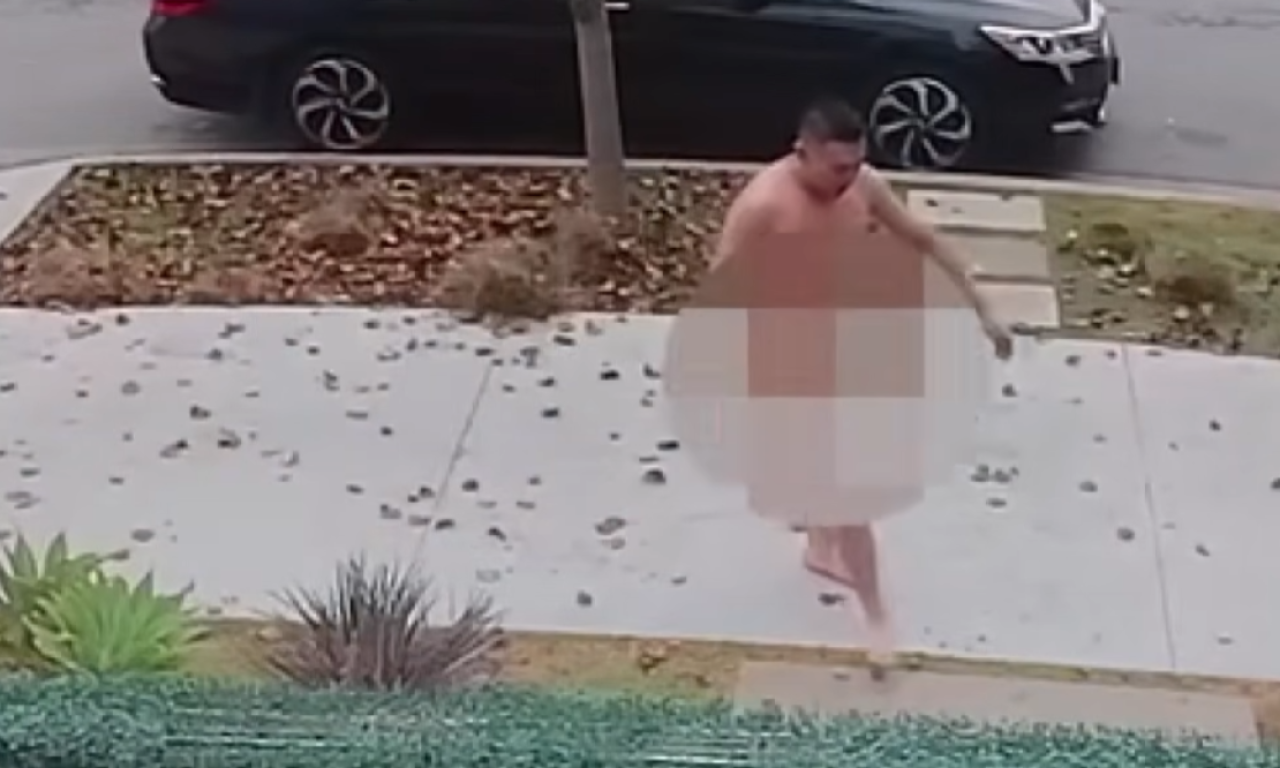 Snimci sa nadzornih kamera zabeležili su golog provalnika kako se spotiče ulicom, vrišti i pokušava da otvori vrata automobila pre nego što se približio kući.