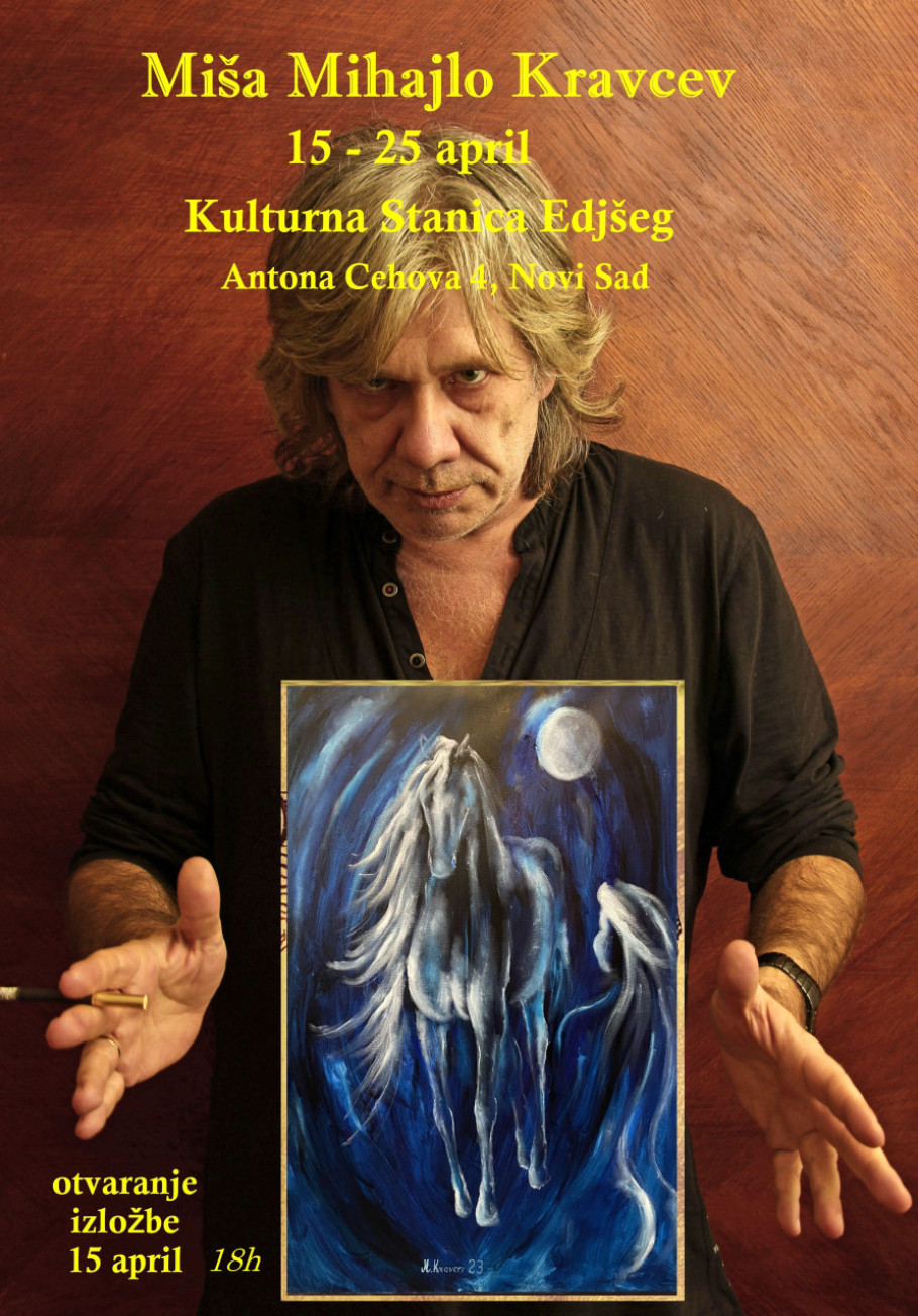Miša Mihajlo Kravcev, naš poznati slikar i književnik, održaće izložbu u Novom Sadu od 15. do 25. aprila u Kulturnoj stanici Eđšeg, Antona Čehova 4.