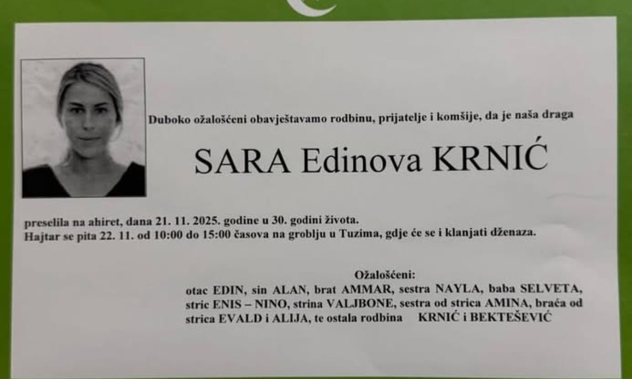 Sara Krnić (29), ćerka poznatog voditelja Edina Krnića, poginula je u saobraćajnoj nesreći. Sahrana je obavljena dana u 15 časova, a otac je objavio emotivnu umrlicu koja je slomila srca.