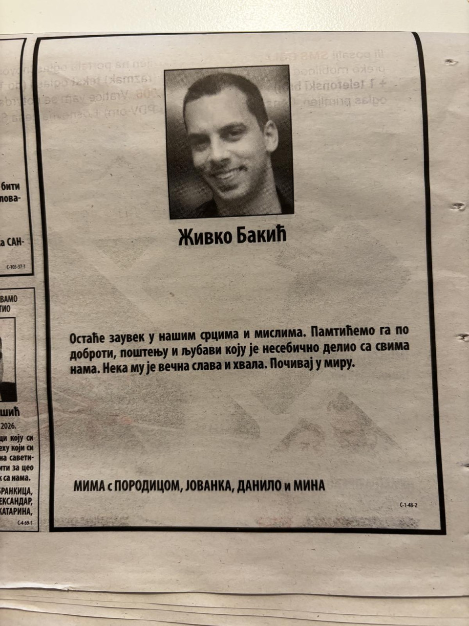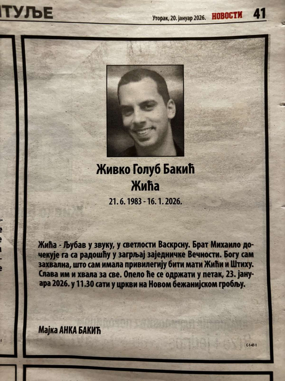 Anka Bakić, majka Živka Bakića (43), nekadašnjeg fudbalera Crvene zvezde i , objavila je potresnu čitulju nakon što je njen sin ubijen u mafijaškoj likvidaciji u blizini porodične kuće kod Sopota.