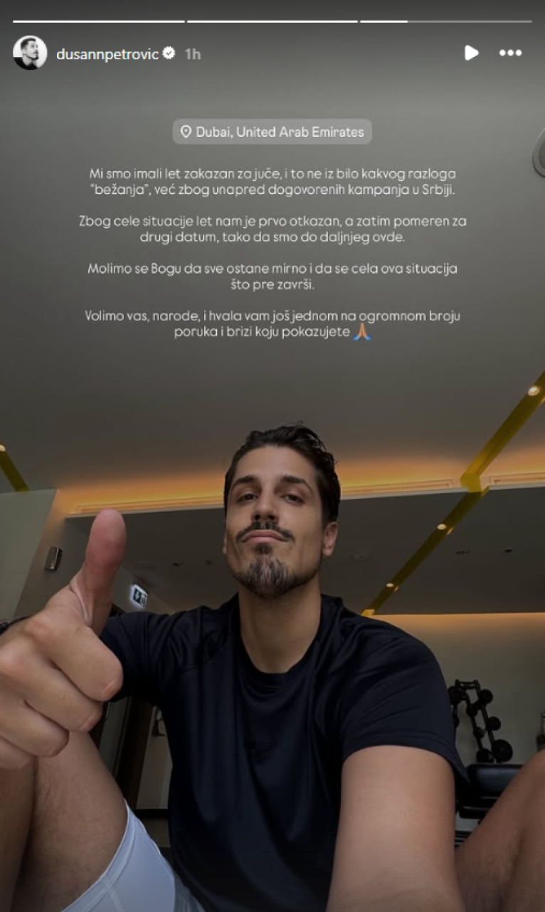"Mi smo imali let zakazan za juče i to ne iz bilo kakvog razloga, već zbog unapred dogovorenih kampanja u Srbiji. Zbog cele situacije let nam je prvo otkazan, a zatim proveravan za drugi datum, tako da smo do daljnjeg ovde. Molimo se Bogu da sve ostane mirno i da se cela situacija što pre završi. Volim vas narode, i hvala vam još jednom na ogromnom broju poruka i brizi koju pokazujete", napisao je Dušan Petrović.