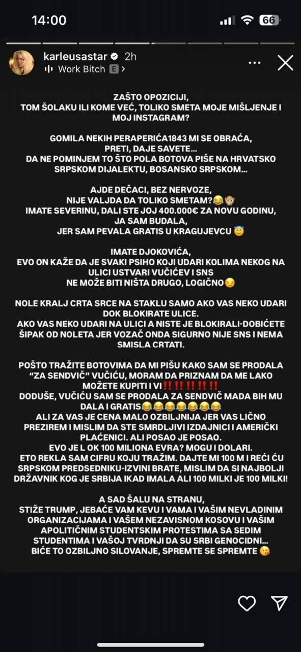 - Zašto opoziciji, tom Šolaku ili kome već, toliko smeta moje mišljenje i moj Instagram? Gomila nekih PeraPerića1843 mi se obraća, preti, daje savete... da ne pominjem to što pola botova piše na hrvatsko srpskom dijalektu, bosansko srpskom... Ajde dečaci, bez nervoze, nije valjda da toliko smetam - upitala je pevačica i nastavila: