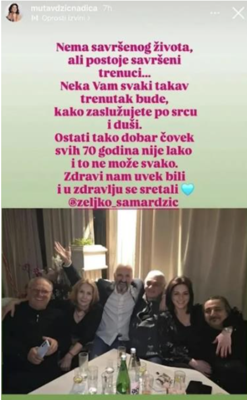 "Nema savršenog života, ali postoje savršeni trenuci... Neka vam svaki takav trenutak bude, kako zaslužujete. Ostati tako dobar čovek svih 70 godina nije lako i to ne može svako. Zdravima uvek bili i u zdravlju se srećali", napisala je Nadica i označila jubilarca.
