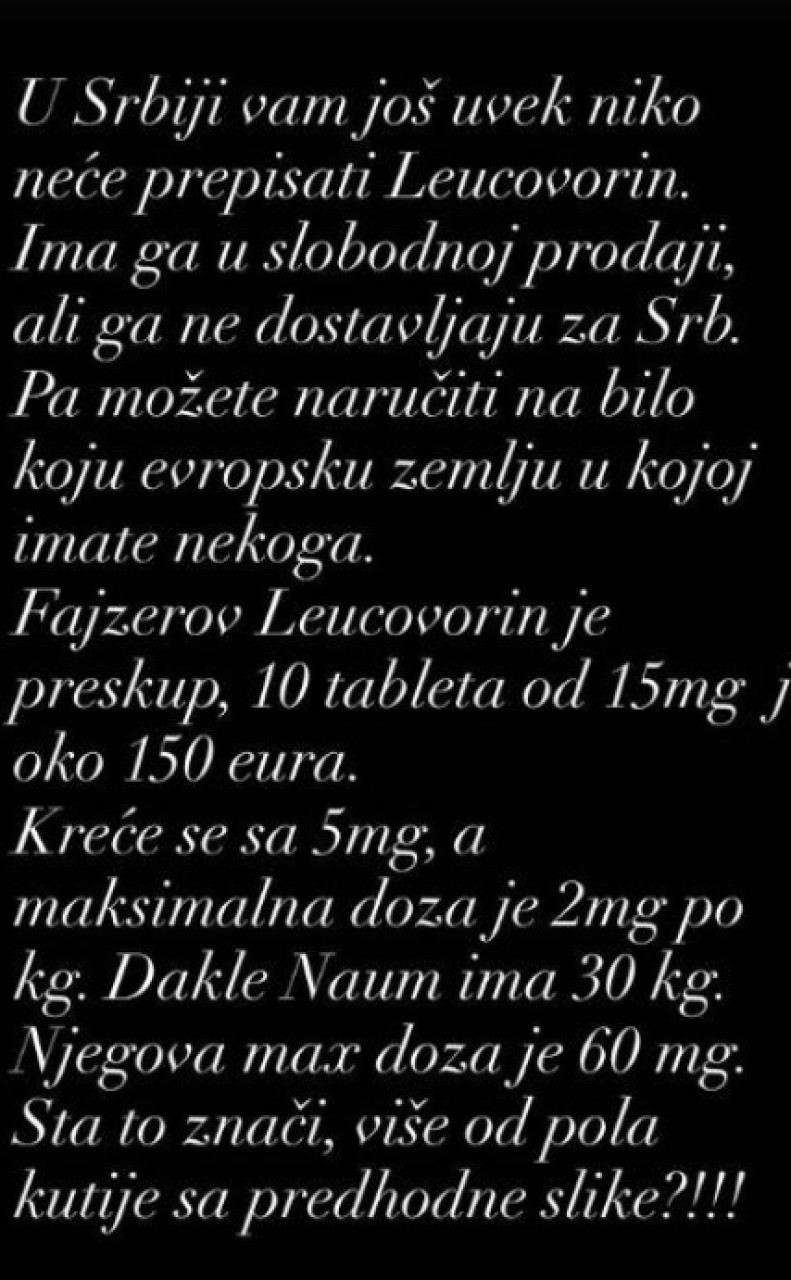 "U Srbiji vam još niko neće prepisati lek Leucovorin. Ima ga u slobodnoj prodaji, ali se ne isporučuje u Srbiju. Možete ga naručiti u bilo koju evropsku zemlju u kojoj imate nekoga", napisala je Jelena.