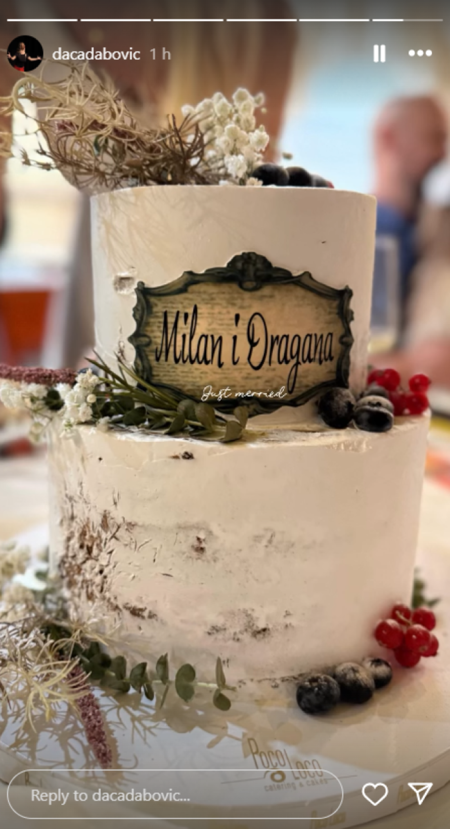 Svadbena torta na dva sprata privukla je posebnu pažnju - elegantna, potpuno bela, sa imenima "Milan i Dragana" u centru, ukrašena prirodnim cvećem i bobičastim voćem.