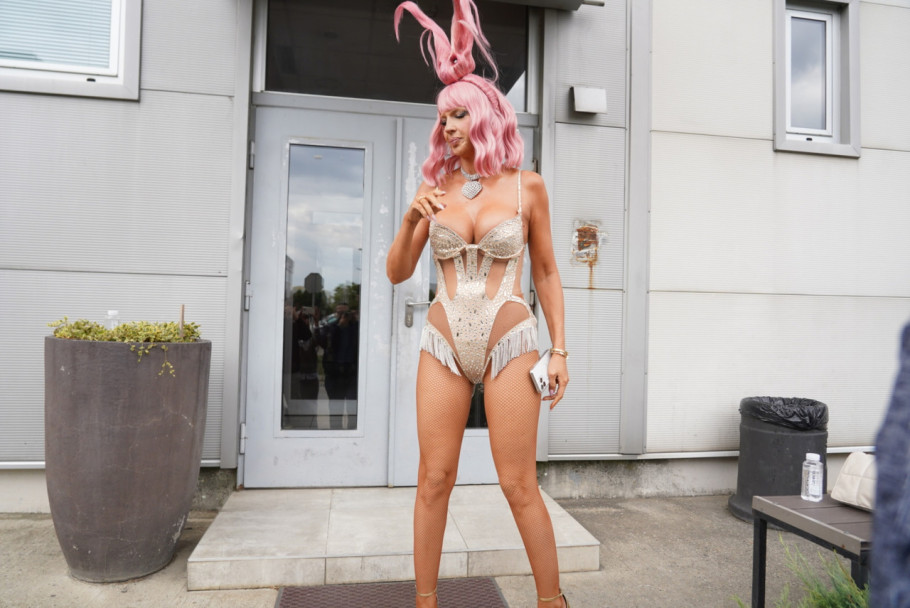 Ali, pravi hit je njena roze perika oblikovana u obliku zečijih ušiju, zbog čega deluje kao da je sa nekog karnevala sišla direktno na parking.