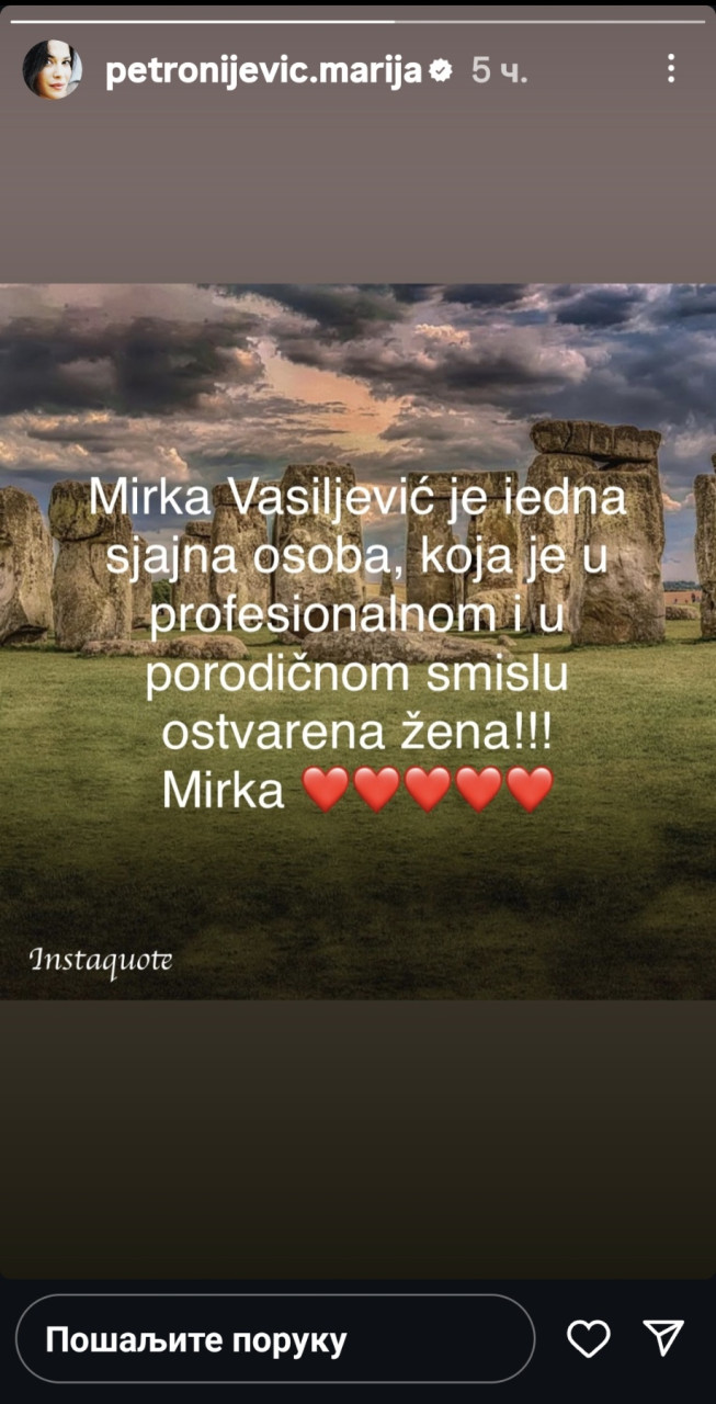U jeku skandala koji potresa porodicu glumice Mirke Vasiljević, njena koleginica i prijateljica, glumica Marija Petronijević, javno joj je pružila podršku putem Instagram storija.