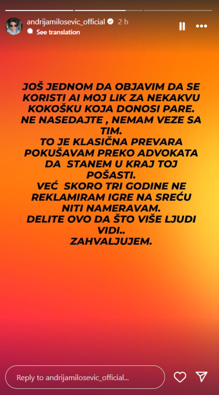 "Još jednom da objavim da se koristi AI moj lik za nekakvu kokošku koja donosi pare, ne nasedajte. Nemam veze sa tim. To je klasična prevara, pokušavam preko advokata da stanem na kraj toj pošasti," napisao je Andrija Milošević.