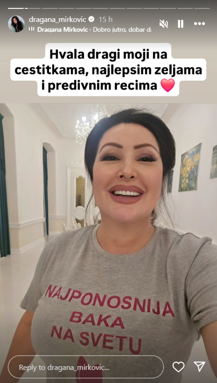 Za to vreme, Dragana Mirković je sa porodicom i prijateljima juče slavila dolazak unuke na svet u svom dvorcu u Beču. Pevačica je blistala od sreće, a za tu priliku je nosila majicu sa jasnom porukom: "Najponosnija baka na svetu".