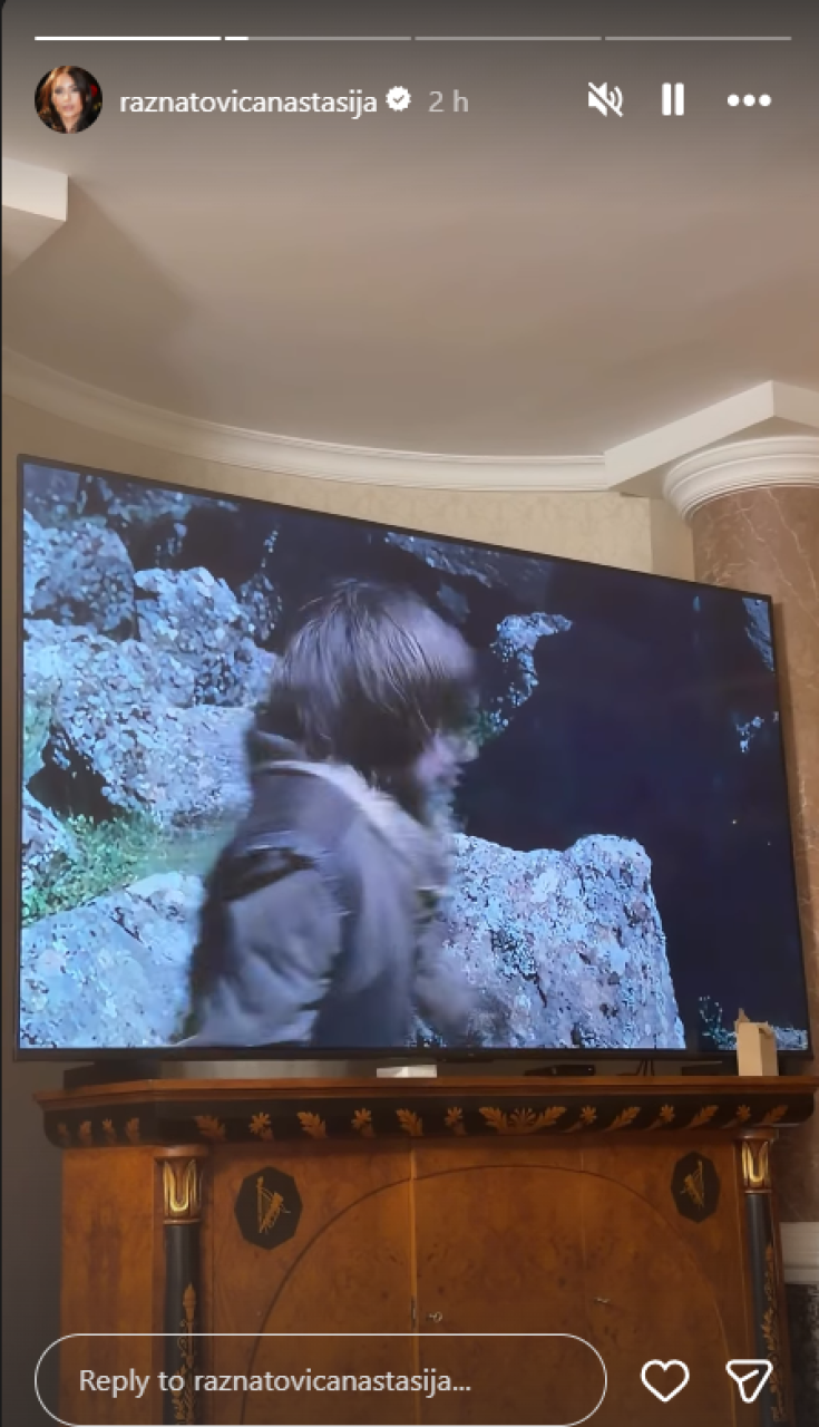U luksuznom domu, Anastasija je snimila impresivan enterijer - ogroman televizor i deo skupocenog nameštaja, dok je uživala gledajući film "Noje", biblijski inspirisanu dramu o poznatoj priči o Nojevoj barci.