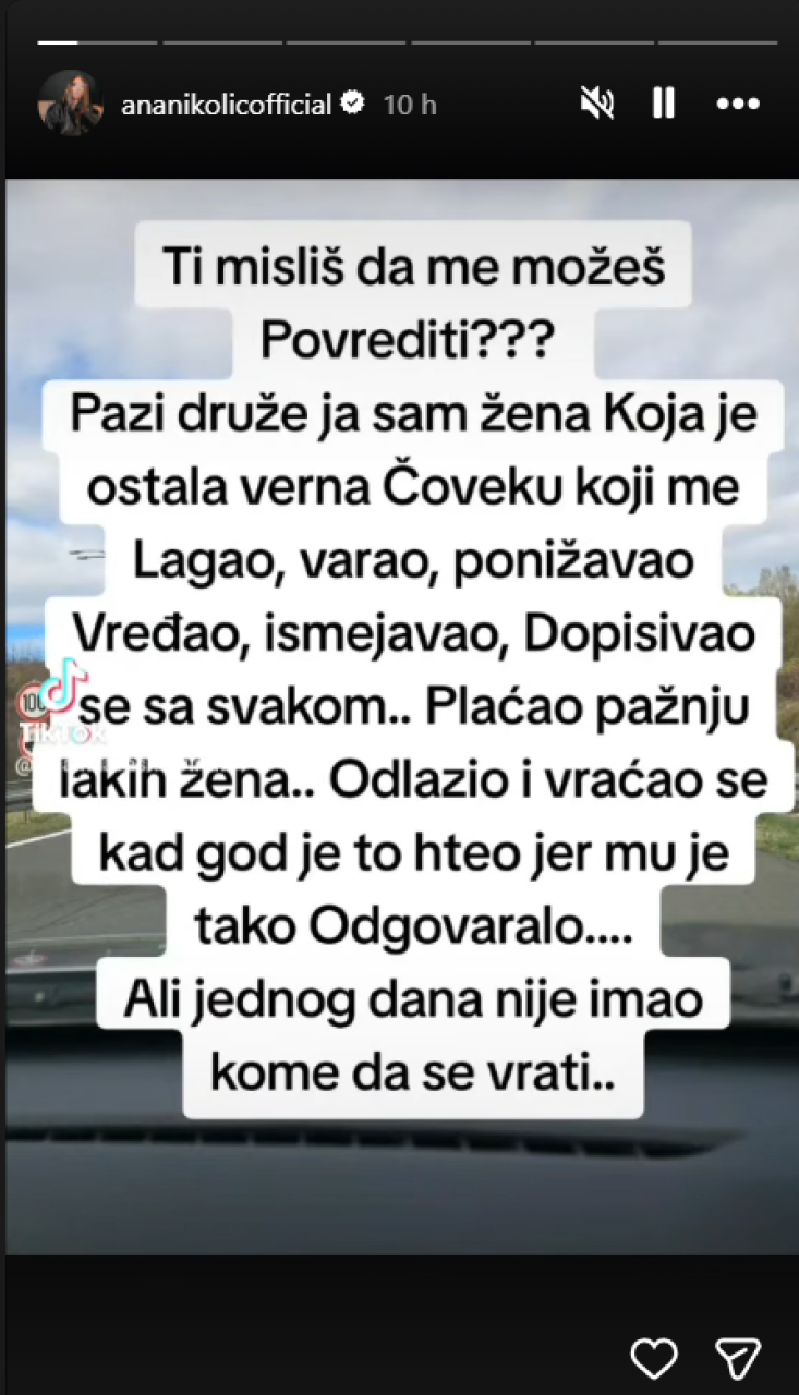Ana Nikolić se već duže vreme suočava sa medijskim pritiskom zbog svog nestabilnog ljubavnog života, koji je nedavno kulminirao i prijavom Raleta za nasilje. Nova objava na njenom Instagram profilu direktno se dotiče bivšeg partnera i svih emotivnih turbulencija koje je proživela.