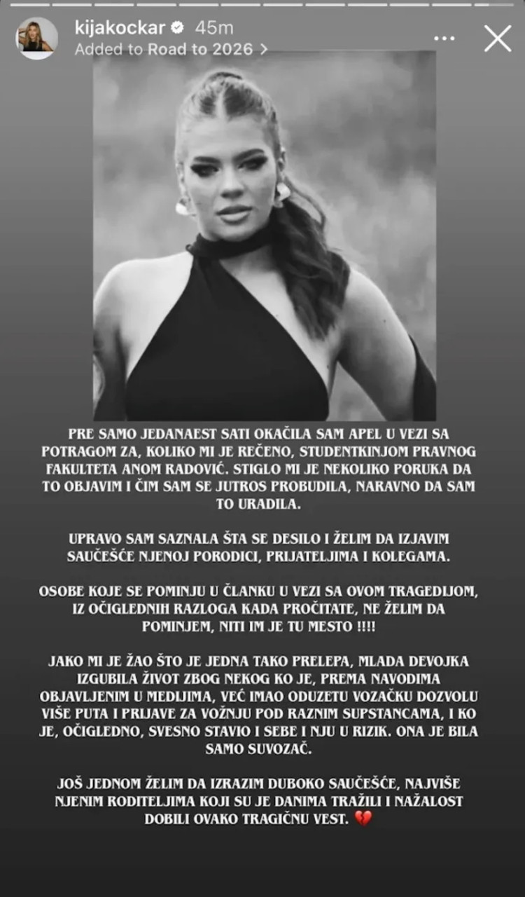 Kija Kockar se sinoć oglasila i putem Instagrama, gde je javno izrazila saučešće porodici nastradale Ane Radović, koja je bila suvozač u tragičnoj nesreći.