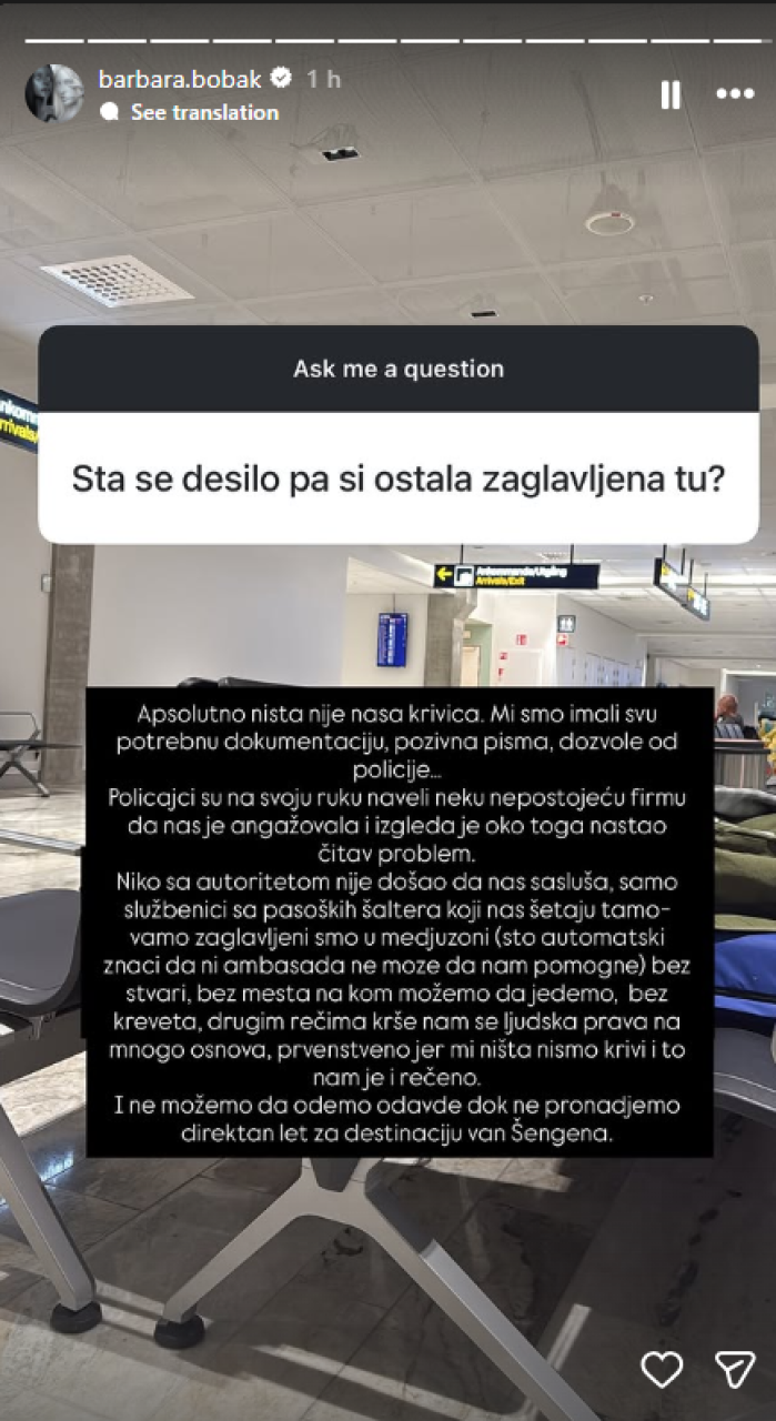 "Zaglavljeni smo u međuzoni (što automatski znači da ni ambasada ne može da nam pomogne) bez stvari, bez mesta na kom možemo da jedemo, bez kreveta, drugim rečima krše nam se ljudska prava na mnogo osnova, prvenstveno jer mi ništa nismo krivi i to nam je i rečeno. I ne možemo da odemo odavde dok ne pronađemo direktan let za destinaciju van Šengena," objasnila je Barbara.