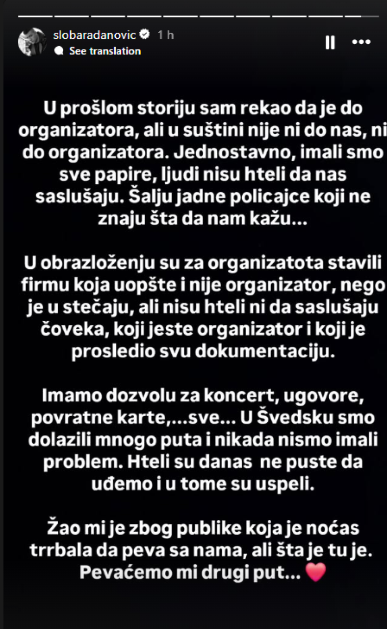 Pevač je istakao da su imali urednu dokumentaciju: "Imamo dozvolu za koncert, ugovore, povratne karte,...sve... U Švedsku smo dolazili mnogo puta i nikada nismo imali problem. Hteli su da nas danas ne puste da uđemo i u tome su uspeli."