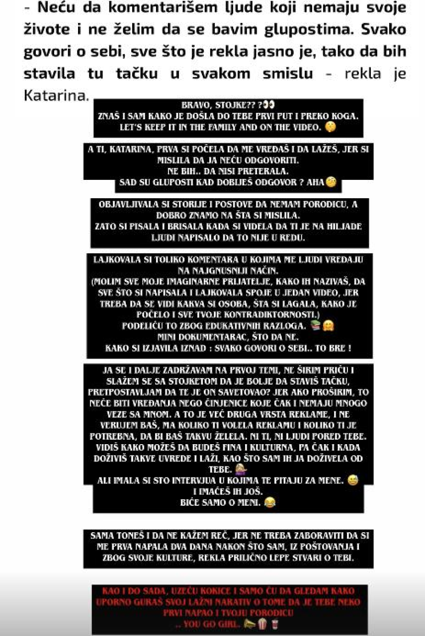 "Za nekoga ko se borio za potomstvo, uz koga sam tada bila svakog trenutka, ti napišeš da ja nemam porodicu. Koliko si se nisko spustila, šta si sebi dozvolila... Tužno. Ostavi zauvek da svi vide kako razmišljaš. Očigledno vidi i narod", napisala je Kristina, aludirajući na osetljivu životnu situaciju Katarine Živković.