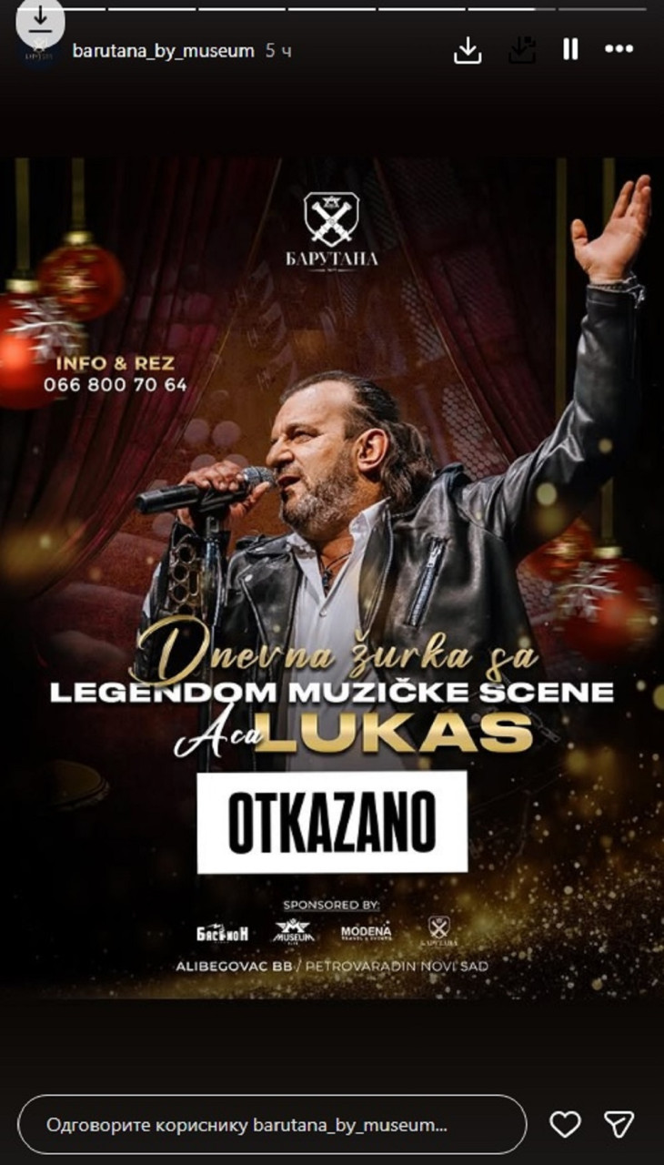Danas je na Instagram nalogu kluba Barutana iz Novog Sada saopšteno da mu je otkazan nastup i u ovom gradu.