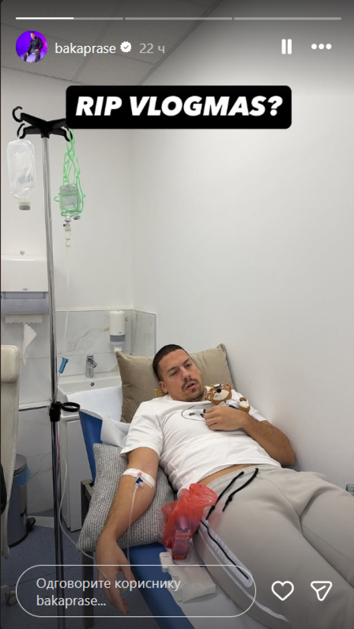 Jutjuber Bogdan Ilić, poznatiji kao Baka Prase, završio je u bolnici. Naime, on je na svom Instagram profilu objavio je fotografiju kako leži u bolničkom krevetu i prima terapiju.