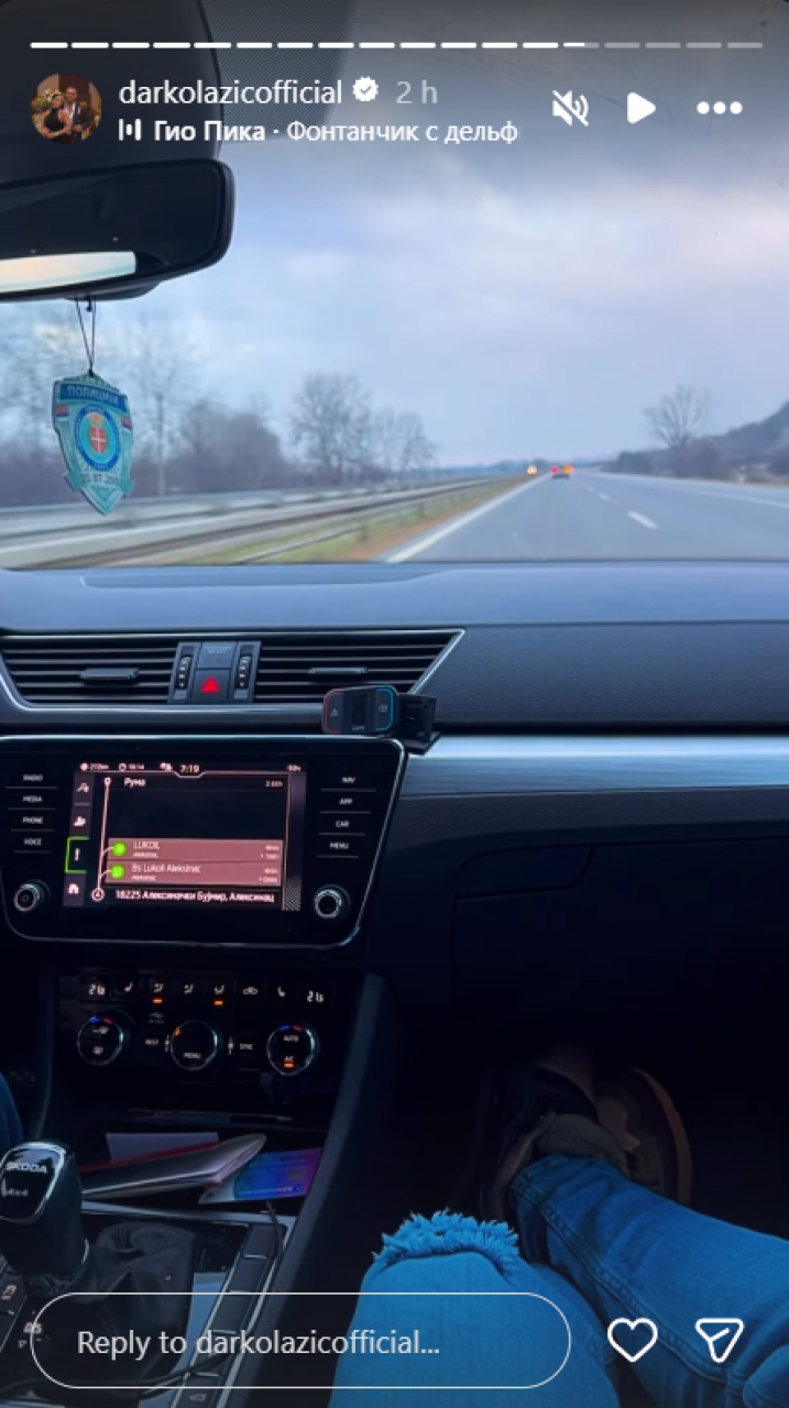 Na retrovizoru visi policijski miris za kola sa jasnim obeležjima, dok se na navigaciji vidi ruta ka Aleksincu, pre nego što se pevač uputi na finalnu destinaciju u Beogradu. Darko je snimio i svoje noge u opuštenom izdanju na mestu suvozača, čime je jasno stavio do znanja da volan prepušta drugima.