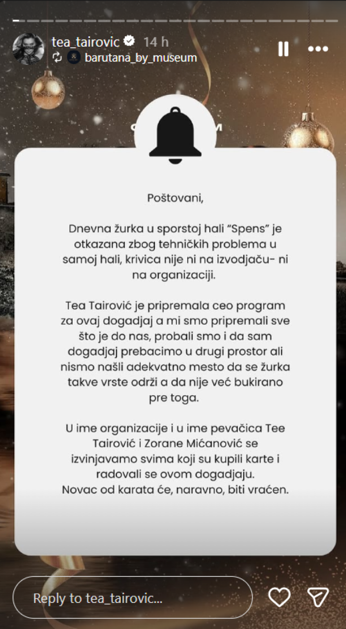 Tim povodom oglasili su se organizatori, a njihovo saopštenje prenela je i sama Tea na svom Instagram profilu kako bi obavestila pratioce o razlozima otkazivanja: