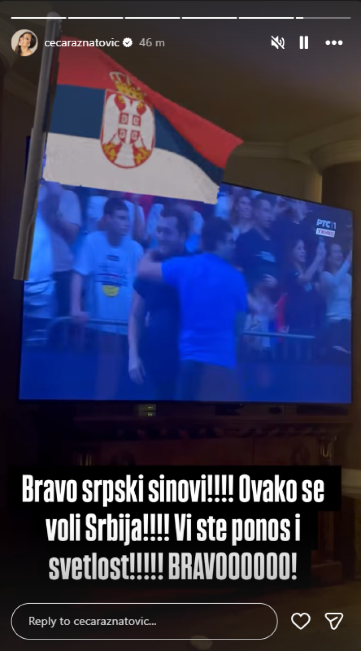 "Bravo, srpski sinovi! Ovako se voli Srbija! Vi ste ponos i svetlost. Bravoooo!" – napisala je Ceca, šaljući snažnu podršku zlatnim momcima.