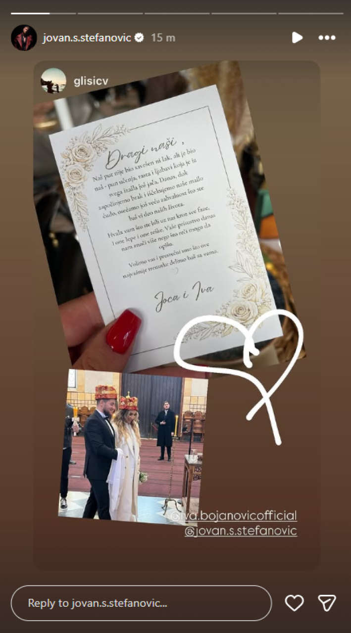 Pevač Jovan Joca Stefanović i njegova partnerka Iva Bojanović krunisali su svoju ljubav crkvenim venčanjem. Svečana ceremonija održana je u krugu najuže porodice i prijatelja, a atmosfera je bila ispunjena radošću, s obzirom na to da par očekuje i svoje prvo zajedničko dete.