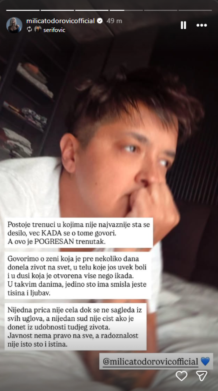 "Postoje trenuci u kojima nije najvažnije šta se desilo, već KADA se o tome govori. A ovo je POGREŠAN trenutak. Govorimo o ženi koja je pre nekoliko dana rodila život, u telu koje još uvek boli i u duši koja je otvorena više nego ikada. U takvim danima, jedino što ima smisla jeste tišina i ljubav. Nijedna priča nije cela dok se ne sagleda iz svih uglova, a nijedan sud nije čist ako je donet iz udobnosti tuđeg života. Javnost nema pravo na sve, a radoznalost nije isto što i istina", poručila je Šerifovićeva.