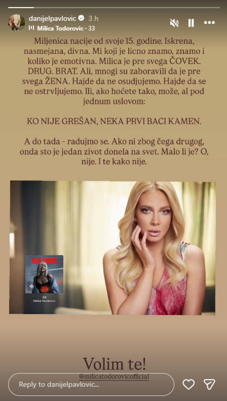 "Miljenica nacije od svoje 15. godine. Iskrena, nasmejana, divna. Mi koji je lično znamo, znamo i koliko je emotivna. Milica je pre svega čovek, drug. brat. Ali, mnogi su zaboravili da je pre svega žena. Hajde da ne osuđujemo. Hajde da se ne ostrvljujemo. Ili ako hoćete tako, može, ali pod jednim uslovom: ko nije grešan, neka prvi baci kamen. A do tada, radujmo se. Ako ni zbog čega drugog, onda što je jedan život donela na svet. Malo li je? O, nije. I te kako nije", poručio je Danijel.