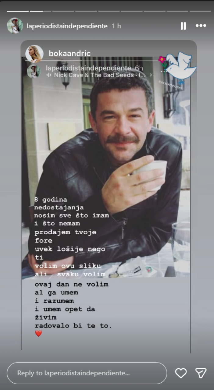 "8 godina nedostajanja. Nosim sve što imam i što nemam. Prodajem tvoje fore, uvek lošije nego ti. Volim ovu sliku, ali svaku volim."