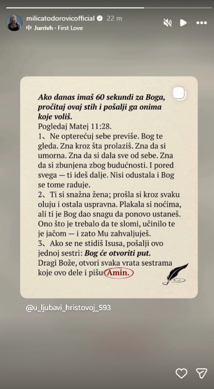 Milica je putem „storija“ objavila stihove koji nose duboku poruku o izdržljivosti i Božijoj ljubavi, pozivajući svoje pratioce da pročitaju Mateja 11:28. U tekstu se, između ostalog, navodi: