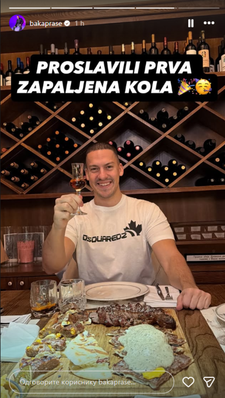 "Proslavili prva zapaljena kola", napisao je Baka Prase, dok je u kameru nazdravljao uz osmeh, ne pokazujući ni trunku žaljenja.
