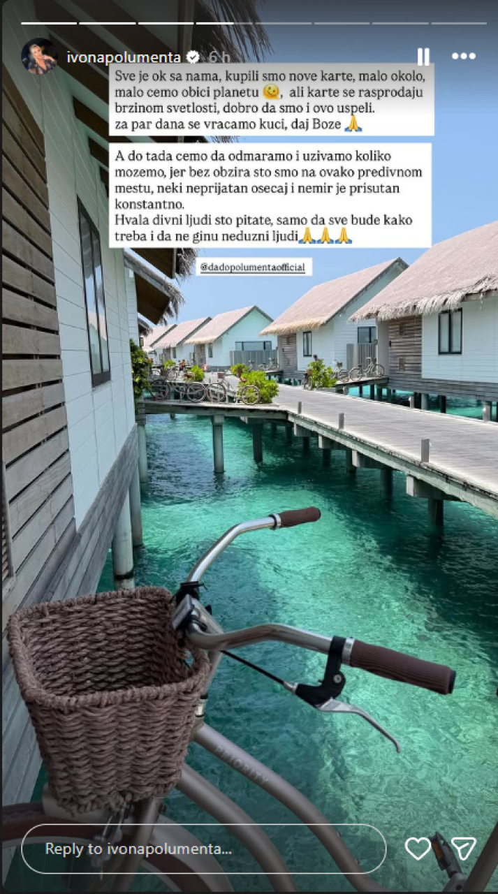 "Sve je ok sa nama, kupili smo nove karte, malo okolo, malo ćemo obići planetu, ali karte se rasprodaju brzinom svetlosti, dobro da smo i ovo uspeli. za par dana se vraćamo kući, daj Bože. A do tada ćemo da odmaramo i uživamo koliko možemo, jer bez obzira što smo na ovako predivnom mestu, neki neprijatan osećaj i nemir je prisutan konstantno. Hvala divni ljudi što pitate, samo da sve bude kako treba i da ne ginu nedužni ljudi, napisala je Ivona Polumenta na Instagramu.