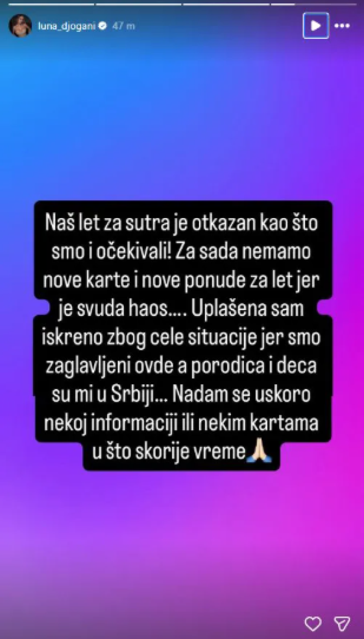 „Naš let za sutra je otkazan kao što smo i očekivali. Za sada nemamo nove karte i nove ponude za let jer je svuda haos. Uplašena sam iskreno zbog cele situacije jer smo zaglavljeni ovde, a porodica i deca su mi u Srbiji. Nadam se uskoro nekoj informaciji ili nekim kartama u što skorije vreme.“
