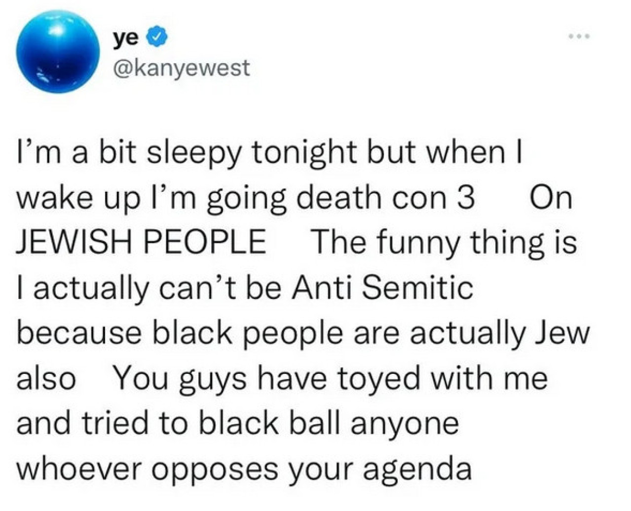 U bizarnoj objavi, reper koji je promenio ime u Ye, napisao je da će uskoro ići na "death con 3 na Jevreje", aludirajući na stepen pripravnosti oružanih sila Sjedinjenih Američkih Država, poznato kao DEFCON (defense readiness condition).