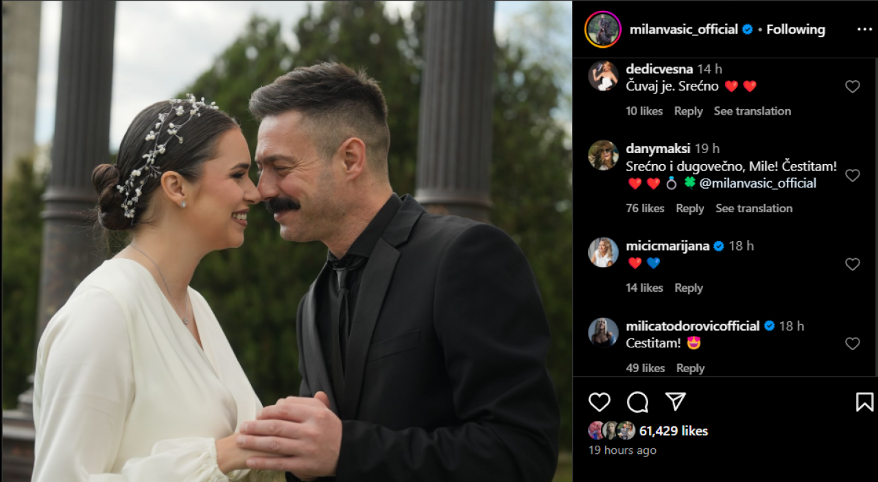 Popularni glumac Milan Vasić nedavno je otkrio da je stao na „ludi kamen“ sa Majom Ilievski, a sada je zatrpan čestitkama kolega i prijatelja sa estrade. Njegova objava na Instagramu, gde je podelio emotivne fotografije sa venčanja, izazvala je buru pozitivnih komentara i čestitki.