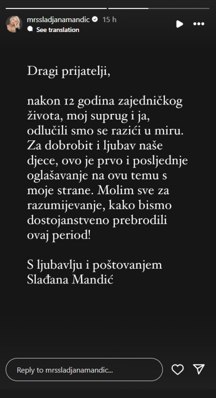- Dragi prijatelji nakon 12 godina zajedničkog života, moj suprug i ja, odlučili smo se razići u miru. Za dobrobit i ljubav naše dece, ovo je prvo i poslednje oglašavanje na ovu temu s moje strane. Molim sve za razumevanje, kako bi smo dostojanstveno prebrodili ovaj period! S ljubavlju i poštovanjem Slađana Mandić - napisala je ona.